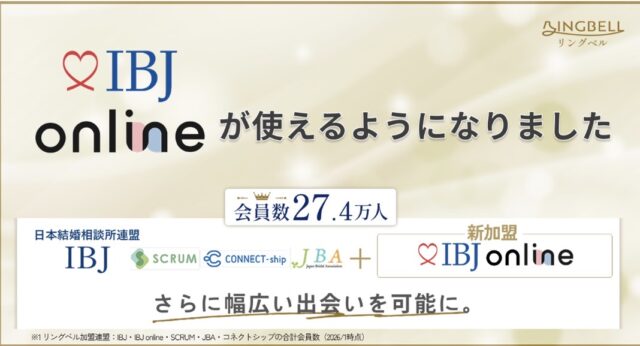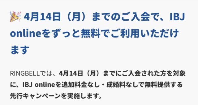 ※2026年4月現在、新サービス開始にあたり、リングベルではIBJオンラインの追加料金なし、成婚料なしの太っ腹キャンペーンを実施しています。